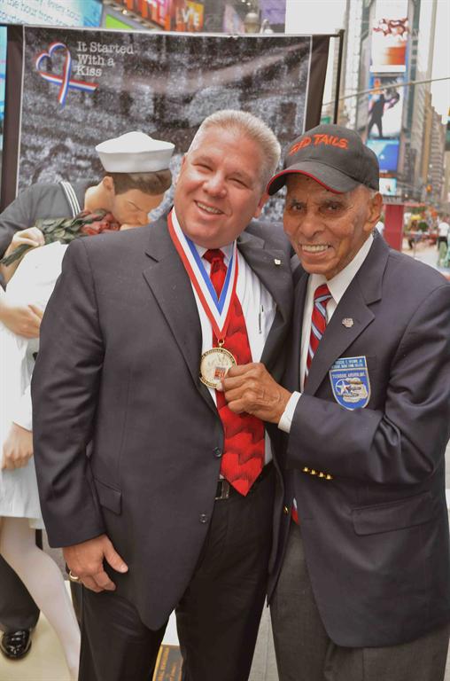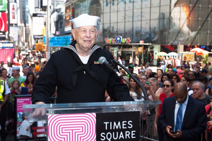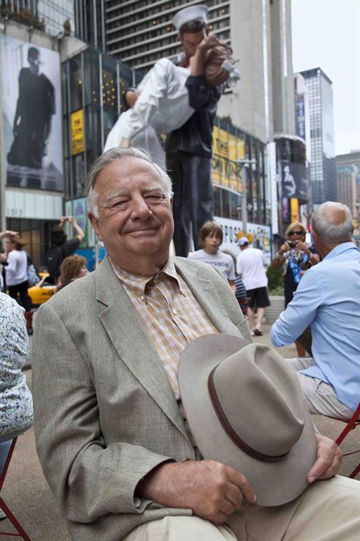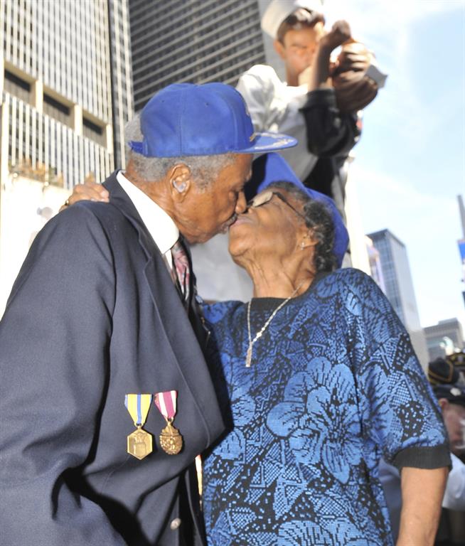 WWII veteran Sydnor Thompson and his wife, Harriette, of Charlotte, NC, re-enacted the famous "kiss seen 'round the world" during at the press event held in Times Square on August 14, 2014 to officially announce the beginning of the countdown to the 70th anniversary of the end of World War II. More... Click here to see more photos of the 2014 media event. Click here to read August 14, 2014 media release announcing the beginning of the countdown to the 70th Anniversary of the end of World War II that will be celebrated on the weekend of August 14 - 16, 2015.