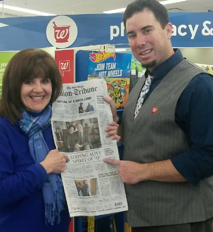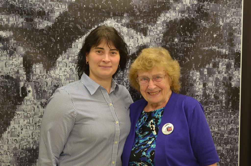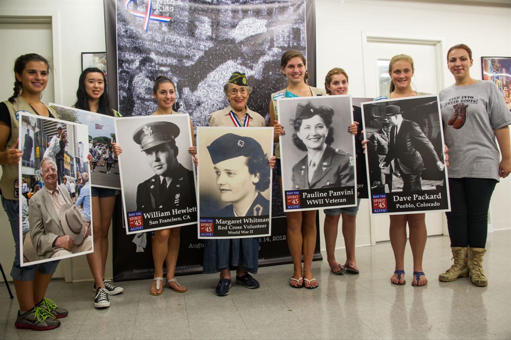 Spirit of '45 national spokespersons Jerry Yellin and Gloria Bullard re-enact the Times Square Kiss 2012_________________________________________________________________________________________________________________________________________________ Walgreens introduces video salute to the Greatest Generation During the 2012 press conference held in front of the Walgreens Time Square store, Jerry Telson, District Manager for New York City operations, received a Spirit of '45 National Leaders Medal in recognition of his company's support for the observance of National Spirit of '45 Day. The medal was presented by National Spirit of '45 Day spokesman Dr. Roscoe Brown, and Joy Beebe, a British WWII war bride from Salem, OR, whose wedding photos was included among the hundreds in the "Kiss" mosaic. Following the press conference, Walgreen's management and staff invited the group to a "wrap party" to enjoy some refreshments and pose for photos with the Kiss mosaic. "What a day!" said Frank Caldwell, who served in the Pacific. "This is like a dream come true -- celebrating the day we learned we could all go home-- and in Times Square!" Click here for more photos (courtesy of David Steele) Prior to the press conference, the group assembled in front of a life sized edition of artist Seward Johnson's famous sculpture depicting the "Kiss" that was placed in Time Square's Duffy Plaza by the Sculpture Foundation to commemorate the Day. Joy Beebe and her daughter, Barbara, in Times Square with photos of Joy's husband Carl during the August 14, 2012 event hosted by Walgreens. |
