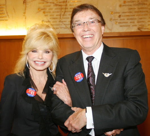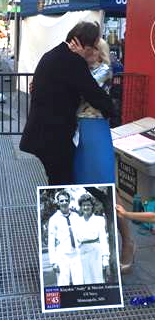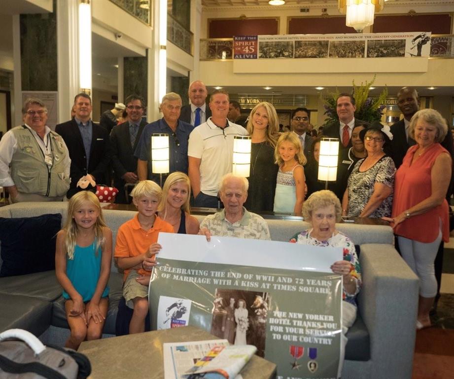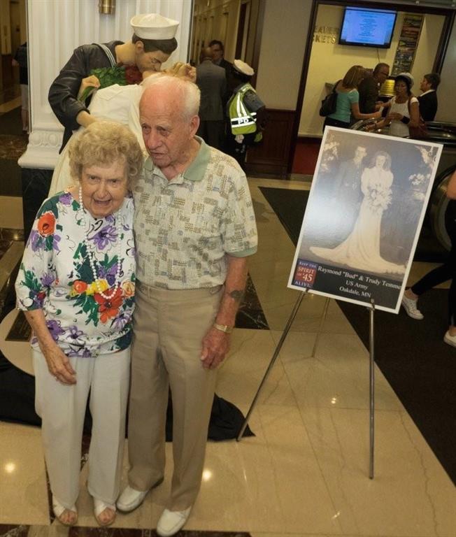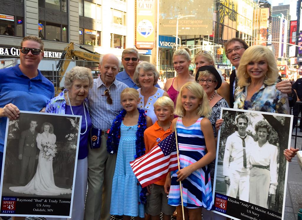 Note: It is best to scan an “8×10” photo if possible, as photos that are any smaller will be grainy when scanned. Click here for stories of August 14, 1945 | Scroll down for Times Square Spirit of '45 Day events 2010 - 2016 | | 2016 Bud and Trudy Temme in 1944 and re-enacting "the Kiss seen 'round the world" in Times Square on August 14, 2016 with their family and fellow Minnesotan Loni Anderson and her husband Bob Flick. Bud and Trudy Temme flew to New York City from Minnesota with more than a dozen members of their family to represent their generation by re-enacting the Kiss in Times Square under the giant video screen. Bud and Trudy were married in February 1944, a year before Bud shipped out to fight in the Liberation of Europe, receiving a Bronze Star and Purple Heart for his service. More... The Temme family and New Yorker Hotel staff and Trudy and Bud with the Seward Johnson sculpture depicting the famous "Times Square Kiss" in the lobby of the New Yorker Hotel. The Temme Family were joined by fellow Minnesotan, Actress Loni Anderson and her husband Bob Flick, an original member of the The Brothers Four. Loni's parents - Andy and Maxine Anderson - were married on Veterans Day on November 11, 1943 when Andy was training to become a Navy in-flight radio operator and later served in the South Pacific. More Loni and Bob have been helping promote public awareness and participation in Spirit of '45 Day since 2010, when it was passed unanimously by both houses of the U.S. Congress. Loni and Bob at 2010 Spirit of '45 Day event in Los Angeles, in the lobby of the historic New Yorker Hotel with Seward Johnson's sculpture of the Kiss on August 14, 2016. Loni's parents Andy and Maxine Anderson. Loni and Bob re-enacting the Kiss in Times Square. Following the group photo and Kiss re-enactment in Times Square, the Loni and Bob and the Temme Family a placed a ceremonial wreath at the East Coast WWII Memorial in Battery Park that looks out on the Statue of Liberty in New York Harbor. 2016 Spirit of '45 Day wreath laying at East Coast WWII Memorial, southern end of Battery Park, New York City | 2015__________________________________________________________________________________________________________________________________________________ Spirit of '45 70th Anniversary Commemorative Weekend begins with a mass "Kiss in" in New York's Times Square The Spirit of '45 70th Anniversary Commemoration Weekend kicked off with a press announcement in Times Square at noon on Friday, August 14, followed by a mass re-enactment of the famous kiss that became the symbol of hope, love and freedom around the world - and the Spirit of '45! Hundreds of couples gathered for the public "Kiss in" organized by the Times Square Alliance in front of the 25ft Seward Johnson sculpture depicting the image of the most famous embrace of the 20th century. Parallel kick off announcements were be made simultaneously in front of the monumental "Kiss" sculptures in Sarasota, FL and in San Diego, CA, and in front of the Battleship Iowa in San Pedro, CA.