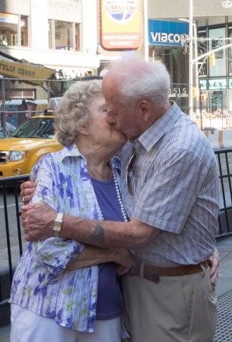 Each year we add hundreds of photos of WWII couples to the video mosaic that plays throughout the day on Walgreens giant screens on August 14 - the day WWII ended and they began to build a better future for America and the world. WWII Couples honored on Anniversary of Times Square Kiss Walgreens shares video mosaic of photos throughout the day on August 14 Click here to watch the Spirit of '45 Day video that honors the couples of WWII that Walgreens shows on the jumbo screens of its Times Square store throughout the day each year on August 14. Click on the photo to see the video. The image of the "Times Square Kiss" is the official symbol of national Spirit of '45 Day. To honor the men and women of the Greatest Generation who created the families of America's future after WWII, Spirit of '45 is inviting the public to send in '40's wedding pictures so they can be archived in a video mosaic of the famous Kiss photograph. The video plays throughout the day on Walgreens jumbo screens on August 14 - the anniversary of the day spontaneous celebrations broke out across America at the news that World War II had ended. Click on image twice to see full screen version of Spirit of '45 Day message. Click here to see video on multiple screens. Each year, a couple volunteers to come to Times Square to represent the men and women of our Greatest Generation who were married during or after WWII and re-enact "the Kiss seen around the world." Join us in Times Square for the Annual Kiss re-enactment and group photo ! 42nd Street and Broadway - Monday, August 14, 2017 - 12:00 noon Come dressed in '40's fashion and be part of the annual photo that is taken under the Walgreens jumbo screen! (Sailors, nurses and Rosie the Riveter look-a-likes especially welcome!) WWII vets Ray and Ellie Williams posed for photos under Walgreens giant screens as the 2015 edition of the annual "WWII Couples" video featuring their wedding photo played overhead. They were joined by Walgreen employees who handed out gift bags to the crowd and posted for photos with "National Athem Girl" Janine Strange, Dani Masterson (Bugles Across America), Ray and Ellie, Gotta Swing Dancers Theresa Werner and James Martin, Paula Stoeke (Seward Johnson Atlelier), Donna Herbst (Atria Senior Living), and Val Pfundstein (Spirit of '45 Day Coordinator NYC). Thank you, Walgreens! Walgreens has been showing its Spirit of '45 Day congratulatory video on its jumbo screens of its Times Square store since 2012. Walgreens has had a store in Times Square since the 1920's, and its logo can be seen over the shoulder of the kissing sailor in the photograph that was taken on August 14, 1941, by Navy journalist Victor Jorgensen. Jorgensen photo of kissing sailor Video of Times Square Kiss video at Night