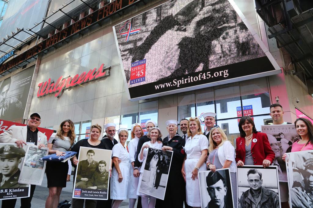2014__________________________________________________________________________________________________________________________________________________ The August 14, 2014 press event in Times Square attracted by international media interest, and was covered by Newsday, the Wall Street Journal and other leading news outlets. More... Countdown to Spirit of '45 WWII 70th Anniversary Commemoration announced in Times Square On August 14, 2014, WWII veterans gathered under the Walgreens sign to announce the beginning of the countdown to a 70th Anniversary Commemoration Weekend that the Spirit of '45 Day coalition organized in 2015.