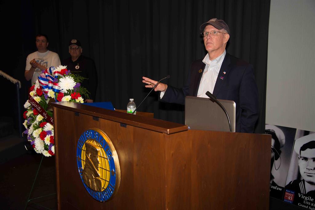 Thanks to U-Haul International for sponsoring the Spirit of '45 Memorial Day float each year, to Dignity Memorial for providing wreaths for placement at the Wall of Gold Stars at the National WWII Memorial, and to Walgreens for donating poster photos of those who gave their lives in service to our country.  Capt.Jerry Yellin marches down Constitution Avenue with youth volunteer carrying photo of his wingman Phil Schlamberg, who was KIA on the day the two of them flew the final combat mission of WWII on August 14, 1945. Yellin was the Honorary Grand Marshal of the National Memorial Day Parade in 2014 and 2014, and makes numerous public appearances and speeches on behalf of Spirit of '45 Day throughout the year. At the end of the Parade route, youth continue marching on 17th Street to the National World War II Memorial where they place red, white and blue flowers in a wreath in front of the Wall of Gold Stars that represents the more than 400,000 Americans who made the ultimate sacrifice during the war. After they finish marching in the National Memorial Day Parade, youth place flowers in wreath in front of the Wall of Gold Stars at the World War II Memorial. Wreath and flowers provided by Dignity Memorial (Murphy Funeral Home). Photo posters of WWII Gold Stars in the Navy Memorial's Burke Theater awaiting marchers on Memorial Day 2018 "Tommy's Story" - watch the video of a young Marine who made the ultimate sacrifice during the Battle of Iwo Jima